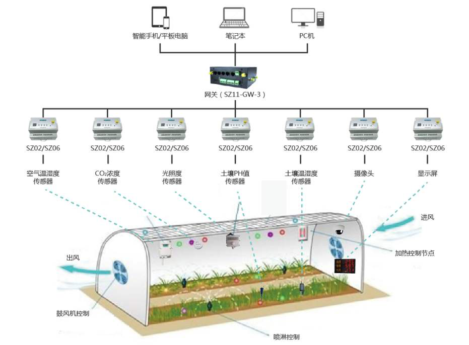 以生態(tài)溫室為例,隨著遠程監(jiān)控系統(tǒng)、無線傳感器監(jiān)測等技術(shù)日趨成熟,物聯(lián)網(wǎng)、大數(shù)據(jù)等技術(shù)已逐步應(yīng)用到了生態(tài)農(nóng)業(yè)建設(shè)中。通過環(huán)境、動植物信息檢測,溫室農(nóng)業(yè)大棚信息檢測和標準化生產(chǎn)監(jiān)控,精準農(nóng)業(yè)中的節(jié)水灌溉等應(yīng)用模式,提高了農(nóng)業(yè)生產(chǎn)的管理效率、提升了農(nóng)產(chǎn)品的附加值、加快了智慧農(nóng)業(yè)的建設(shè)步伐。其主要方式通過安裝于指定的監(jiān)測點的空氣溫濕度傳感器、土壤溫濕度傳感器、土壤PH傳感器、光合有效輻射傳感器、CO2傳感器等設(shè)備實時監(jiān)測空氣的溫濕度、二氧化碳濃度、土壤溫濕度及PH值等相關(guān)數(shù)據(jù);聯(lián)動控制系統(tǒng)由加熱、噴灌、通風、卷簾設(shè)備及其配套PLC及Wifi設(shè)備服務(wù)器組成,當傳感器采集的環(huán)境數(shù)據(jù)與標準值對比超出臨界范圍時,控制器自動啟動相關(guān)硬件設(shè)備對作物生長環(huán)境加熱、澆水、通風、卷簾加減光照輻射,實現(xiàn)作物生長過程精確控制。同時在塑膜日光溫室旁,建立地下沼氣池,沼氣池上方建圈舍及廁所,形成一個封閉的智慧化能源生態(tài)系統(tǒng)。在此系統(tǒng)內(nèi),圈舍溫度在冬天提高3~5℃,為禽畜提供了更適宜的生長條件,使豬的生長期大幅縮短約150天。禽畜糞便為沼氣池提供原料,產(chǎn)出的沼氣用于家庭供暖,殘留的沼渣、沼液作為溫室作物的肥料。此外,豬等禽畜呼吸排出的CO2可促進溫室內(nèi)作物光合作用,蔬菜產(chǎn)量和質(zhì)量明顯提高。