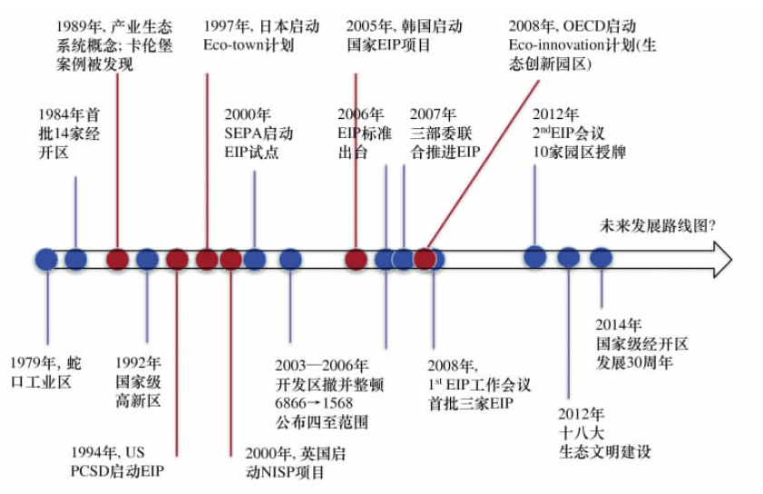 生態(tài)工業(yè)園區(qū)是產(chǎn)業(yè)生態(tài)學研究和實踐的重要載體之一。工業(yè)園區(qū)這一人工經(jīng)濟系統(tǒng)在發(fā)展中有意識地模仿自然生態(tài)系統(tǒng),應(yīng)用系統(tǒng)工程的理論和方法,對現(xiàn)有園區(qū)進行重新規(guī)劃、設(shè)計和建設(shè),以提高資源、能源利用效率,減少污染物產(chǎn)生和排放,改善環(huán)境質(zhì)量,促進經(jīng)濟持續(xù)發(fā)展。2000年以來,歐美國家、澳大利亞、日本、韓國、新加坡、印度、巴西等國家都出現(xiàn)了一系列關(guān)于生態(tài)工業(yè)園區(qū)案例的實證分析。工業(yè)發(fā)達國家生態(tài)工業(yè)園區(qū)發(fā)展的代表性例子包括丹麥、美國、英國、日本和韓國,下圖為幾個主要國家及中國推進生態(tài)工業(yè)園區(qū)發(fā)展的演變概覽。發(fā)達國家現(xiàn)階段關(guān)于生態(tài)工業(yè)園區(qū)發(fā)展的重點問題主要集中在以下方面:(1)生態(tài)化發(fā)展的驅(qū)動力,包括園區(qū)建立物質(zhì)、能量、信息、廢棄物等集成系統(tǒng)過程中潛在干系方之間建立合作聯(lián)系的驅(qū)動力;(2)生態(tài)化發(fā)展準則,目的是定義并識別推動生態(tài)化發(fā)展的創(chuàng)新行動(3)生態(tài)化發(fā)展成功要素,目的是從政治、經(jīng)濟、社會和環(huán)境識別各園區(qū)生態(tài)創(chuàng)新的成功要素;(4)定義針對推動園區(qū)生態(tài)創(chuàng)新有效發(fā)展和管理的關(guān)鍵問題。