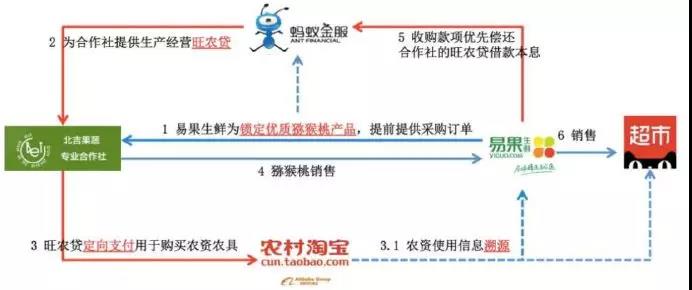 例如:天貓超市的供貨電商易果生鮮與陜西周至縣北吉果蔬專業(yè)合作社簽訂采購協(xié)議。螞蟻金服基于采購訂單,在對訂單進(jìn)行識別并確認(rèn)后,由網(wǎng)商銀行為合作社數(shù)百名果農(nóng)社員提供低息貸款,果農(nóng)拿到這筆貸款后,通過定向支付工具專項(xiàng)用于從農(nóng)村淘寶購買指定的農(nóng)藥、農(nóng)資、農(nóng)具。最后果品通過易果生鮮進(jìn)駐天貓超市進(jìn)行銷售。這種基于產(chǎn)業(yè)鏈形成的閉環(huán)信貸模式,突破了商業(yè)銀行傳統(tǒng)的評級授信要求,也無須另行提供抵押、質(zhì)押、擔(dān)保,提供的資金效率高、環(huán)節(jié)更簡單,利率則遠(yuǎn)低于民間借貸。
