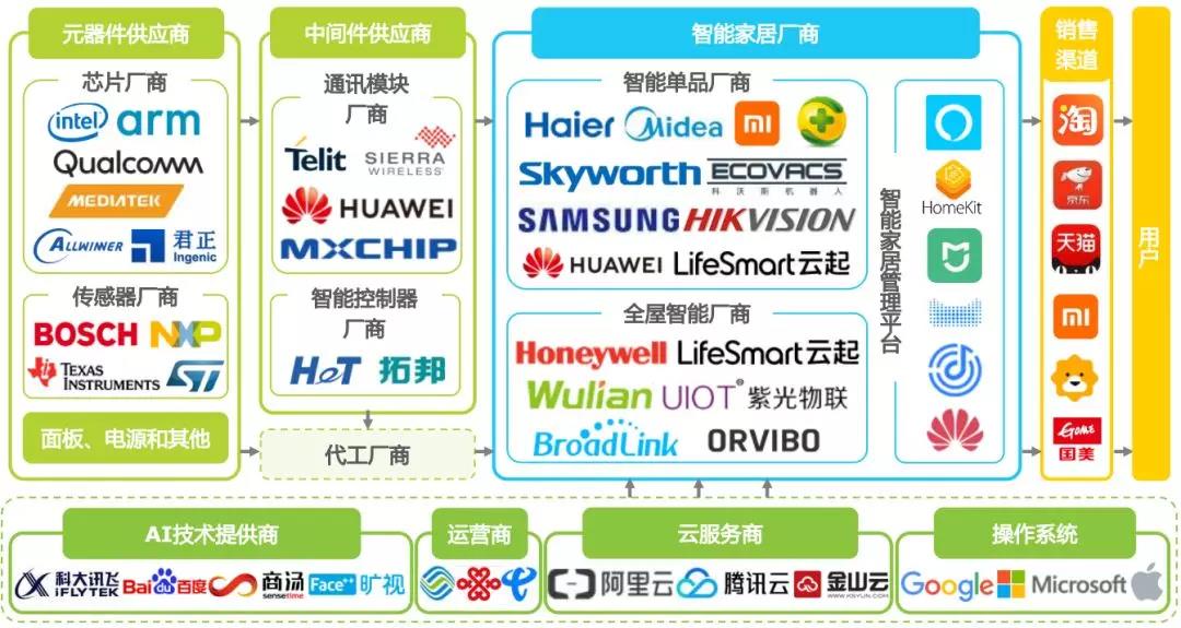 通常所指的智能家居企業(yè)為智能家居品牌商,涵蓋向最終用戶提供終端產(chǎn)品、解決方案和設(shè)備管理控制平臺的企業(yè),底層除物聯(lián)網(wǎng)操作系統(tǒng)、云服務(wù)作為管理控制平臺的支撐外,還包括內(nèi)容服務(wù)、生活服務(wù)等互聯(lián)網(wǎng)增值服務(wù)。智能家居產(chǎn)業(yè)鏈上游主要是芯片、傳感器等元器件供應(yīng),以及通訊模塊和智能控制器等中間件供應(yīng)商。品牌商可以通過線上、線下零售渠道直接向C端用戶銷售終端產(chǎn)品,也可以面向房地產(chǎn)、家裝公司等B端客戶提供整體解決方案。