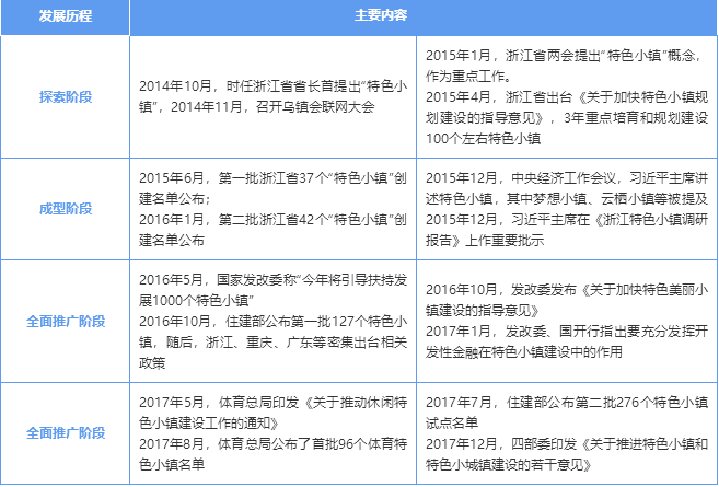 改革開放以來,我國特色小鎮(zhèn)經(jīng)歷了三個發(fā)展階段:第一階段即探索階段,2014年浙江省省長李強首提“特色小鎮(zhèn)”;第二階段為成型階段,習(xí)近平在《浙江特色小鎮(zhèn)調(diào)研報告》上做了重要批示;第三階段為全面推廣階段,這個階段特點為國家發(fā)布引導(dǎo)政策,隨后地方政策密集出臺,全國各地特色小鎮(zhèn)建設(shè)如火如荼。