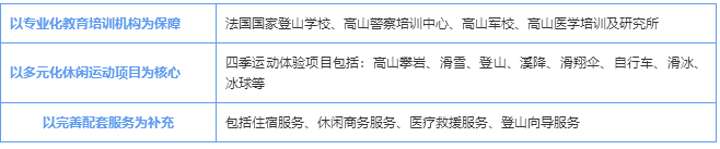 在法國,登山向?qū)︻櫩偷男袨槌袚韶?zé)任,這些以技術(shù)高超、經(jīng)驗豐富,責(zé)任感強而著稱的向?qū)冊谌澜缍枷碛惺⒆u。國立登山滑雪學(xué)校開設(shè)的項目有登山向?qū)А⒒┙叹?、高山協(xié)作、救援、滑翔傘教練。學(xué)校設(shè)備齊全,配有六個可容納20至80人的會議室、一個可容納220人且配有錄像投影機的階梯教室、一棟配有132個標間的宿舍樓、一個自助餐中心、一個健身房、一個器材室及其它科研場所。因為ENSA的存在,沙木尼成為全球登山標準的定制者,完善的培訓(xùn)和卓越的服務(wù)成為其登山產(chǎn)業(yè)發(fā)展的護城河。