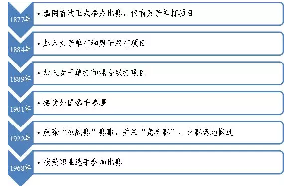 溫網(wǎng)于1877年首次于全英草地網(wǎng)球和門球俱樂部管理之下在溫布爾登Worpl路附近的一塊場地舉行,當時僅有男子單打比賽。1884年,全英俱樂部增加了女子單打和男子雙打比賽,女子雙打和混合雙打則在1889年加入。1922年比賽搬遷到到了如今的Church路場地。如同其他3項“大滿貫”賽事,溫布爾登在1968年網(wǎng)球公開時代到來之前,只對頂級的業(yè)余選手開放。而之后,溫網(wǎng)是所有職業(yè)選手的圣地。