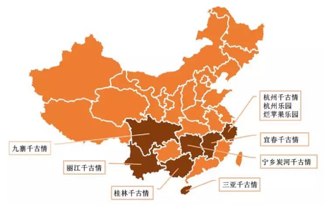 宋城演藝的主題公園主要布局在旅游發(fā)達(dá)城市和地區(qū),目前有9個(gè)主題公園,包括7個(gè)千古情景區(qū),布局城市包括一線旅游城市杭州、三亞、麗江、九寨、桂林,也在二三線旅游城市如寧鄉(xiāng)、宜春進(jìn)行輕資產(chǎn)布局。