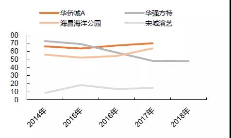 華僑城和海昌海洋公園均有地產(chǎn)開(kāi)發(fā)業(yè)務(wù),其中華僑城以房地產(chǎn)收入為主,2018年上半年旅游業(yè)務(wù)收入占比32%;海昌海洋公園地產(chǎn)收入占比很低,且近年來(lái)聚焦主題公園業(yè)務(wù),地產(chǎn)收入占比明顯下降,從2010年的52%降低到2018年上半年的7%,主題公園營(yíng)運(yùn)收入占比達(dá)93%。