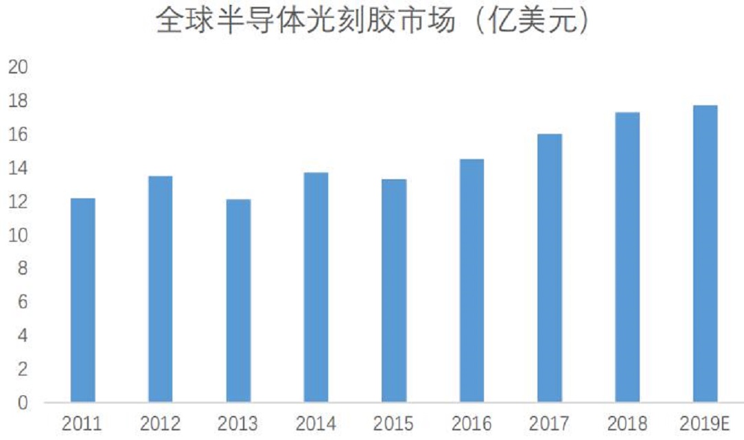 由于半導(dǎo)體光刻膠主要應(yīng)用于半導(dǎo)體制造,故半導(dǎo)體光刻膠市場(chǎng)與對(duì)應(yīng)晶圓廠產(chǎn)能密切相關(guān)。根據(jù)SEMI公布數(shù)據(jù),2018年全球半導(dǎo)體光刻膠市場(chǎng)共17.3億美元,同比增長(zhǎng)2.3%。自2016年來,全球光刻膠市場(chǎng)年均復(fù)合增長(zhǎng)率為9.23%。