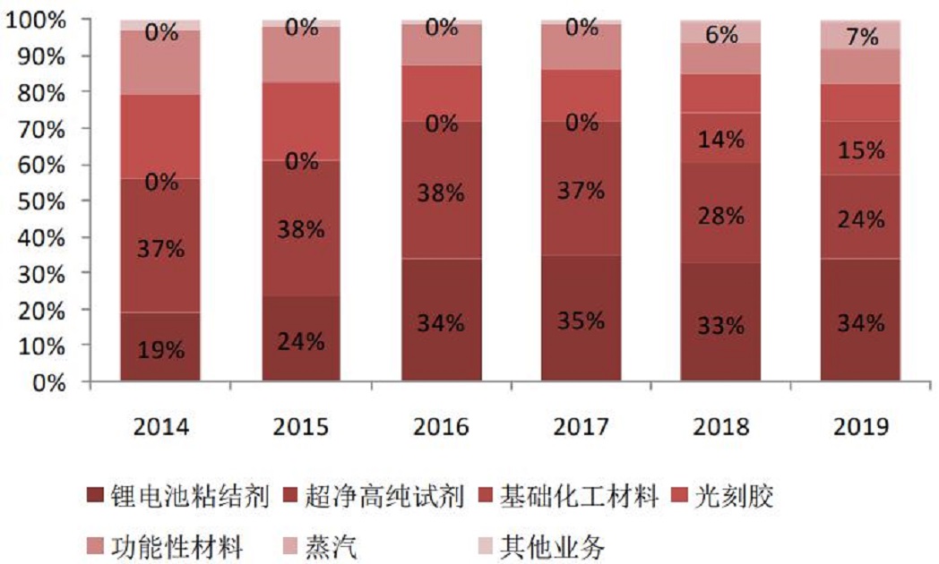 2018年,公司實(shí)現(xiàn)營業(yè)收入14.46億元,同比增長(zhǎng)76.23%,實(shí)現(xiàn)歸母凈利潤(rùn)2.84億元,同比增長(zhǎng)239.37%。其中電子化學(xué)品占公司總營收的64.9%,是公司最主要的收入來源。