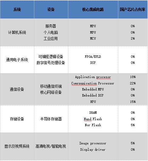 表中計(jì)算機(jī)系統(tǒng)中的MPU、通用電子系統(tǒng)中的FPGA/EPLD和DSP、通信裝備中的 Embedded mpu和DSP、存儲(chǔ)設(shè)備中的DRAM和 Nand flash、顯示及視頻系統(tǒng)中的 Display driver,國(guó)產(chǎn)芯片占有率都是零這就指出了一個(gè)嚴(yán)峻的問(wèn)題,我國(guó)所需核心芯片主要依賴進(jìn)口。半導(dǎo)體產(chǎn)業(yè)關(guān)系國(guó)家經(jīng)濟(jì)和安全命脈,中國(guó)半導(dǎo)體從業(yè)者身肩重責(zé),必須為核心芯片國(guó)產(chǎn)化不斷努力。