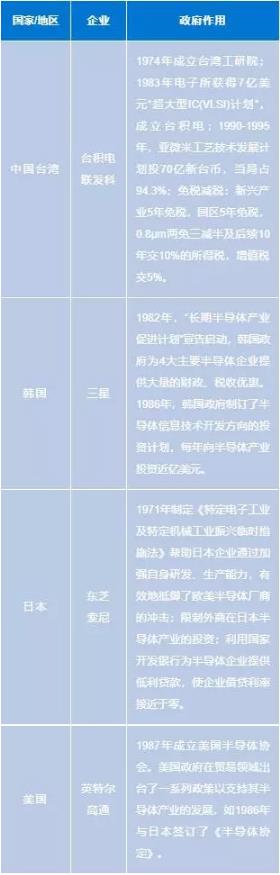 根據(jù)中國(guó)臺(tái)灣、韓國(guó)等國(guó)家/地區(qū)半導(dǎo)體產(chǎn)業(yè)發(fā)展的經(jīng)驗(yàn),政府的扶持具有不可替代的作用。臺(tái)灣地區(qū)1974年成立臺(tái)灣工研院,1987年成立臺(tái)積電,并在其上投入了8年后,才實(shí)現(xiàn)盈虧平衡,走上獨(dú)立的發(fā)展的道路;韓國(guó)政府通過(guò)為國(guó)內(nèi)半導(dǎo)體企業(yè)提供大量的財(cái)政、稅收優(yōu)惠來(lái)支持本國(guó)半導(dǎo)體產(chǎn)業(yè)的發(fā)展。因此,政府的持續(xù)投入是IC制造和發(fā)展的必要條件。